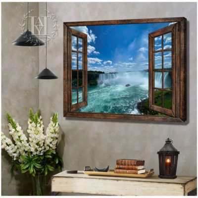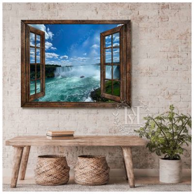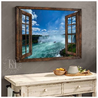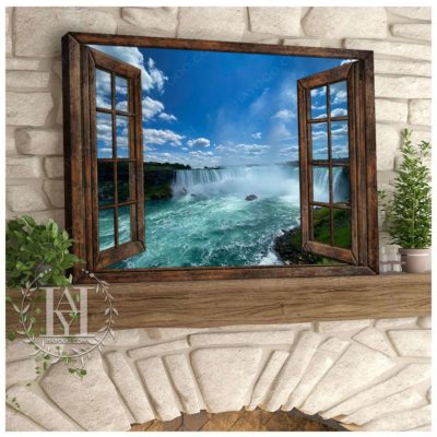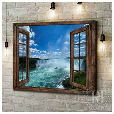 Hayooo Brown Faux Window Canvas Beautiful Waterfall Scene With Blue Sky Wall Art For Home Decor