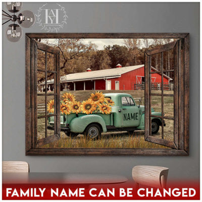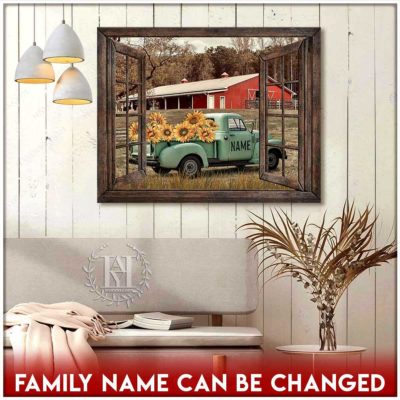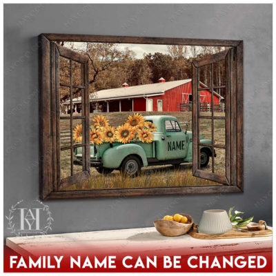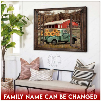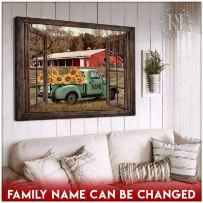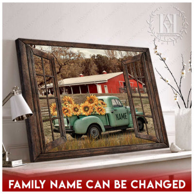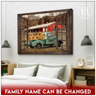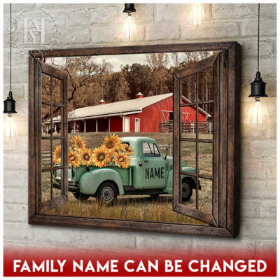 Hayooo Brown Faux Window Canvas Custom Family Name With Red Barn And Teal Pickup Truck Wall Art For Home Decor