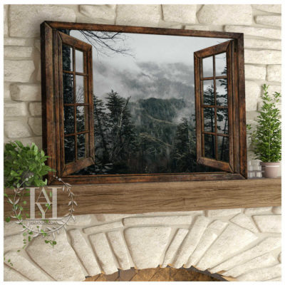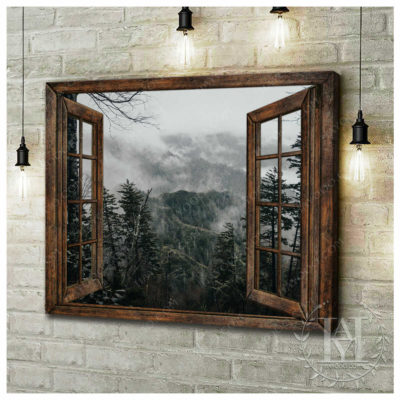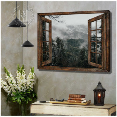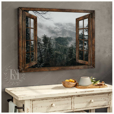 Hayooo Brown Faux Window Canvas Foggy Forest Wall Art For Home Decor