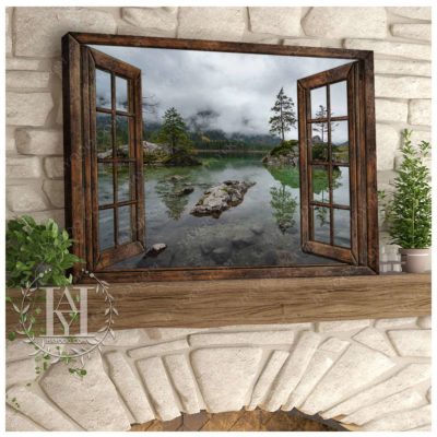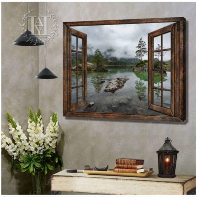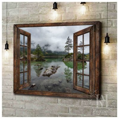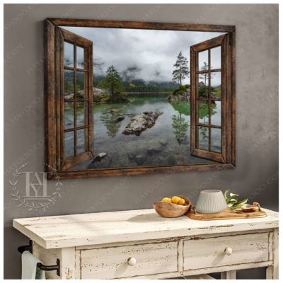 Hayooo Brown Faux Window Canvas Foggy Lake Scene Wall Art For Home Decor