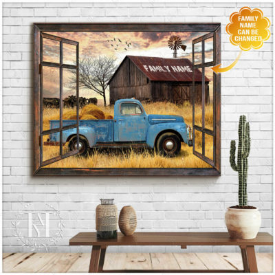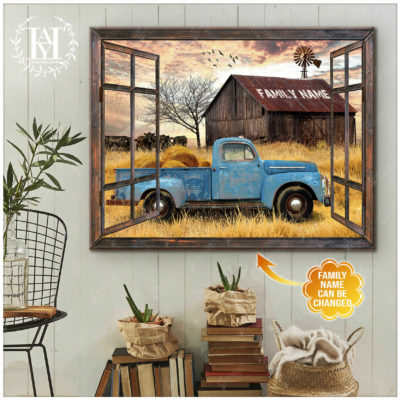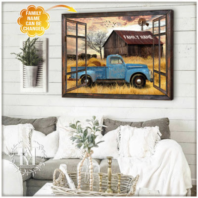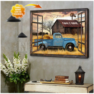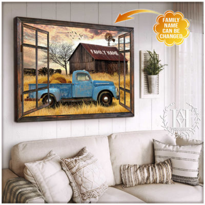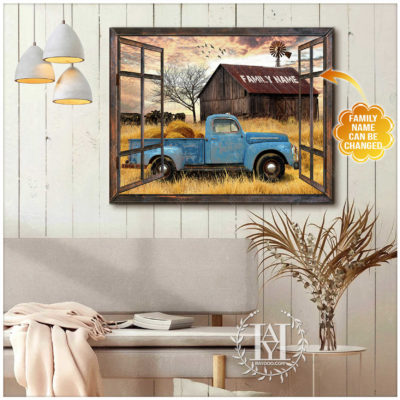 Hayooo Custom Family Name Canvas With Baby Blue Pickup Truck And Rustic Barn Through Faux Window Wall Art For Farmhouse Decor