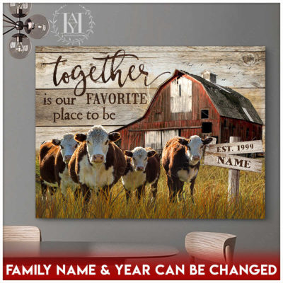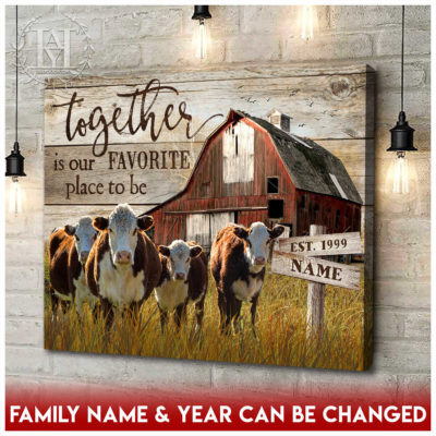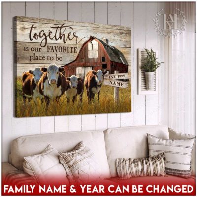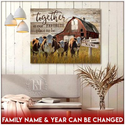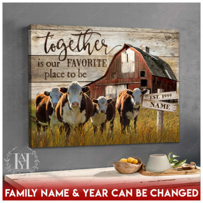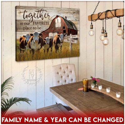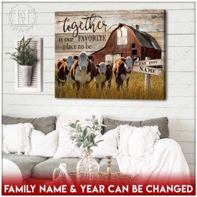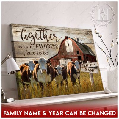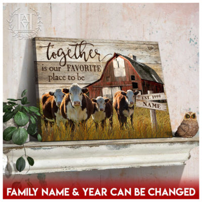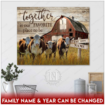 Hayooo Custom Family Name Canvas With Red Barn And Hereford Cows Together Is Our Favorite Place Wall Art For Farmhouse Decor