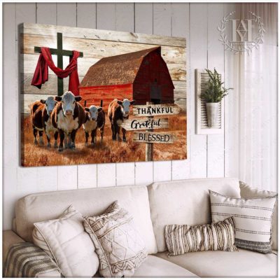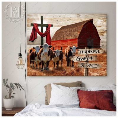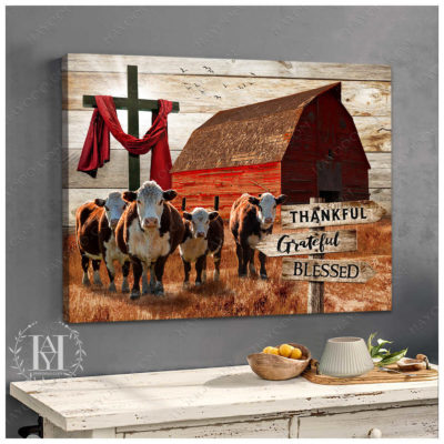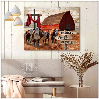 Hayooo Farmhouse Canvas Red Barn And Hereford Cows Thankful Grateful Blessed God Wall Art