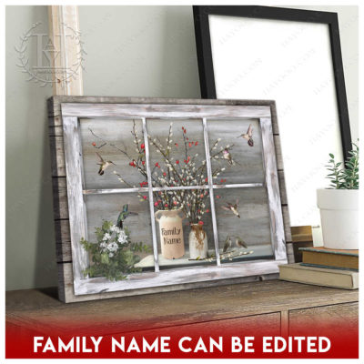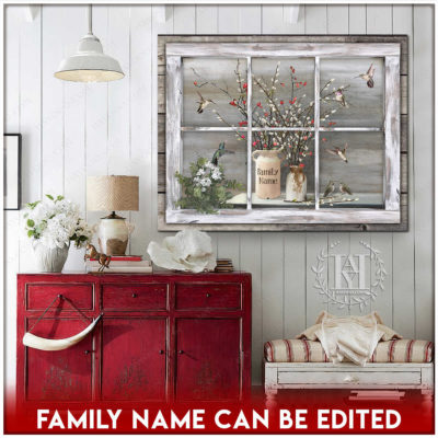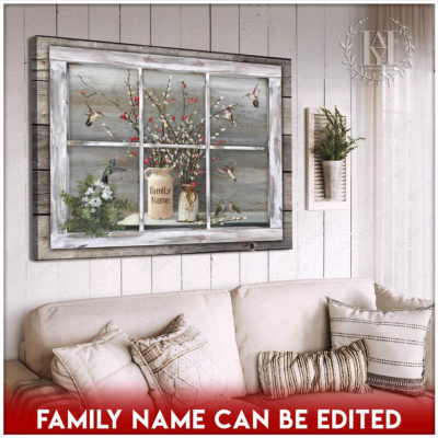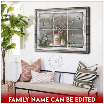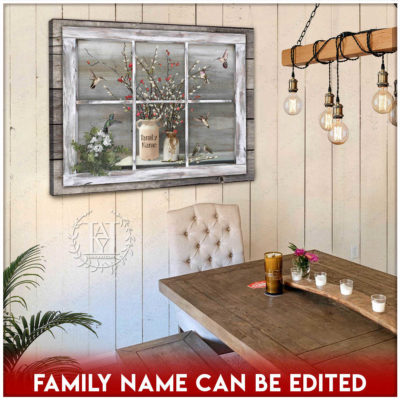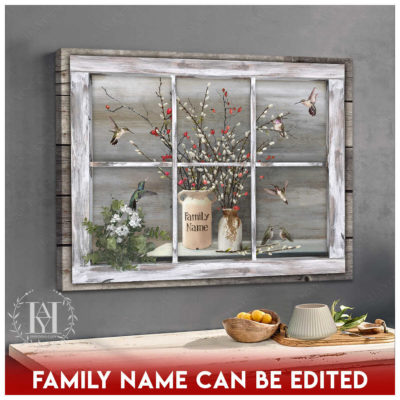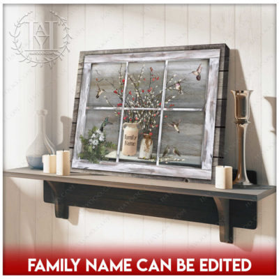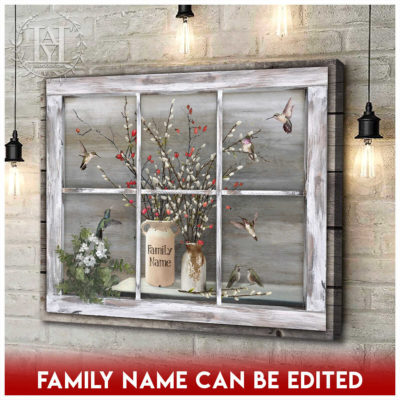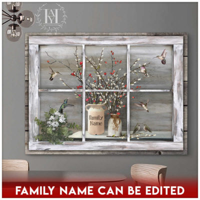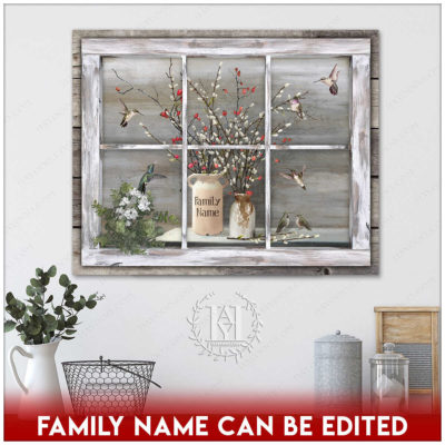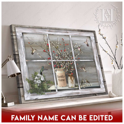 Hayooo Faux Window Canvas Custom Family Name Vintage Window With Pussy Willows And Hummingbirds