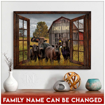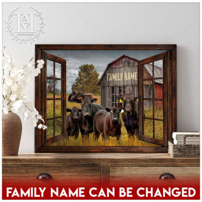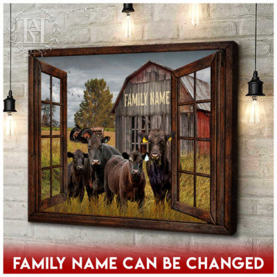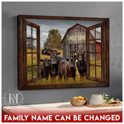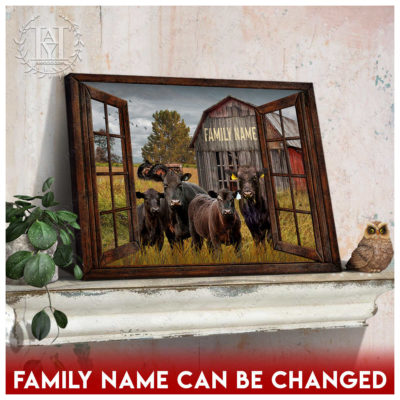 Hayooo Faux Window Canvas Custom Family Name With Angus Cows In Front Of Rustic Barn Wall Art For Farmhouse Decor