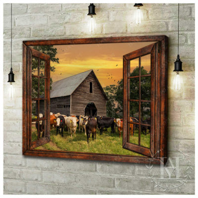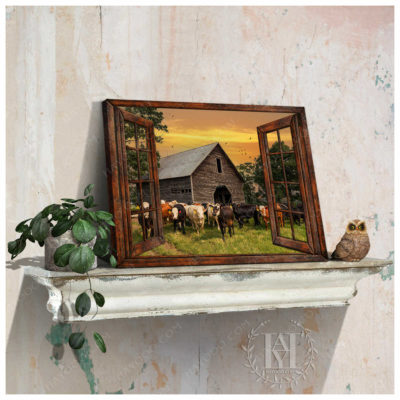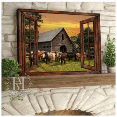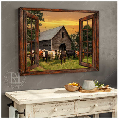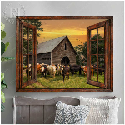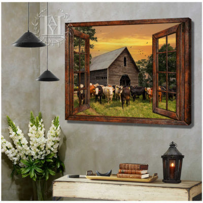 Hayooo Faux Window Canvas Gorgeous Barn With A Herd Of Cows At Sunset Wall Art For Farmhouse Decor