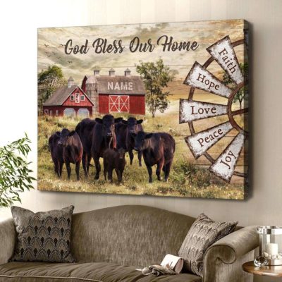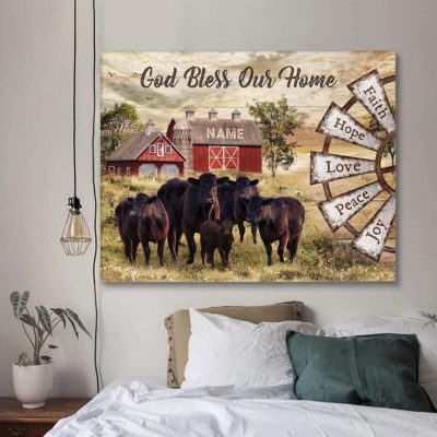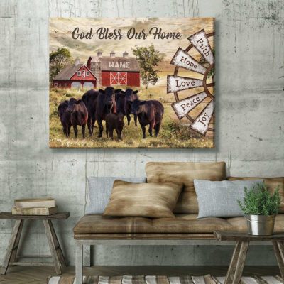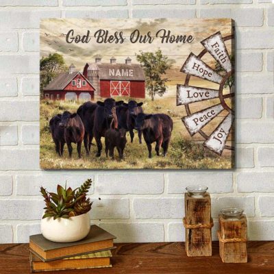Hayooo Personalized Canvas With Red Barn And Angus Cow God Bless Our Home