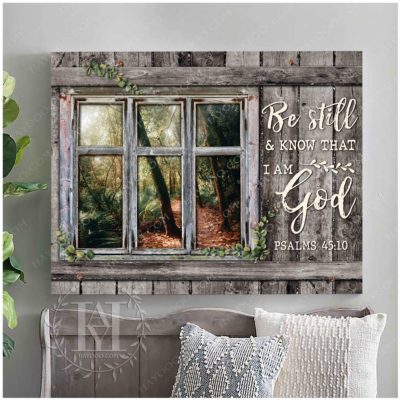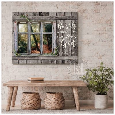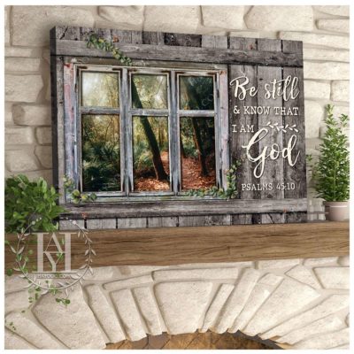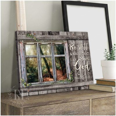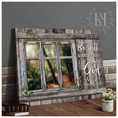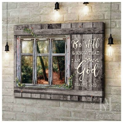 Hayooo Rustic Faux Window Canvas Gorgeous Forest Scene With Bible Verse Be Still And Know That I Am God
