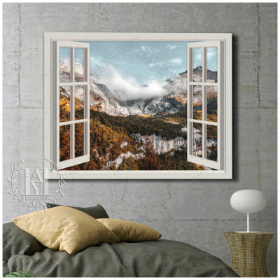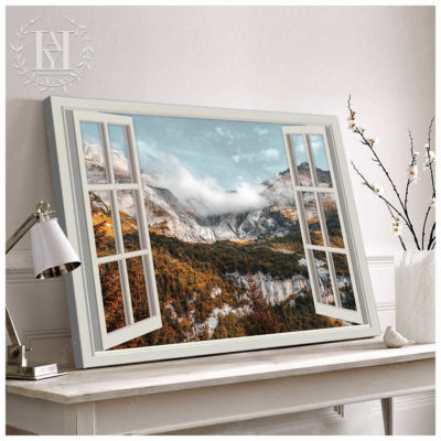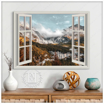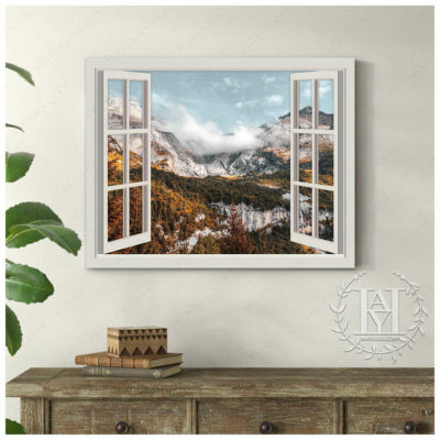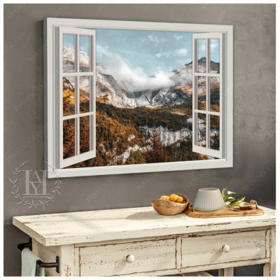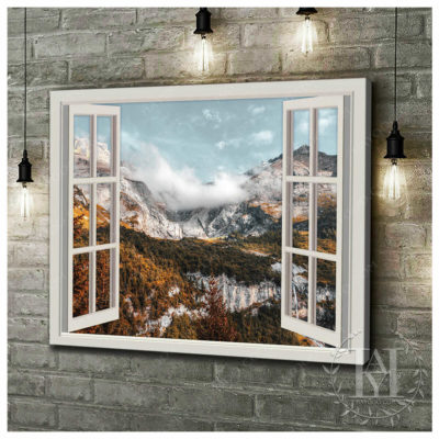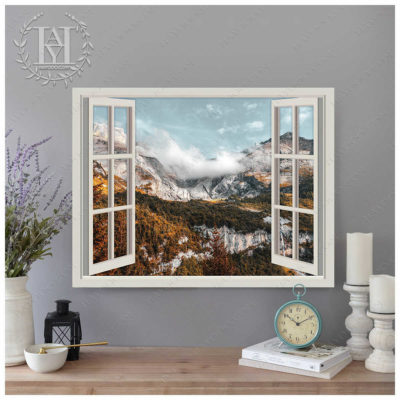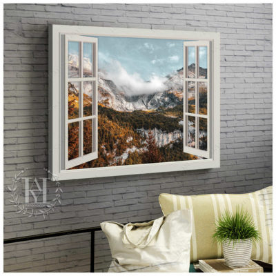 Hayooo White Faux Window Canvas Gorgeous Mountain Scene Wall Art For Home Decor