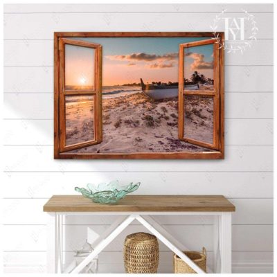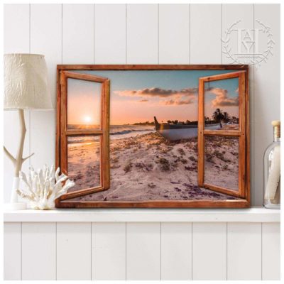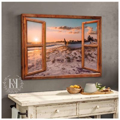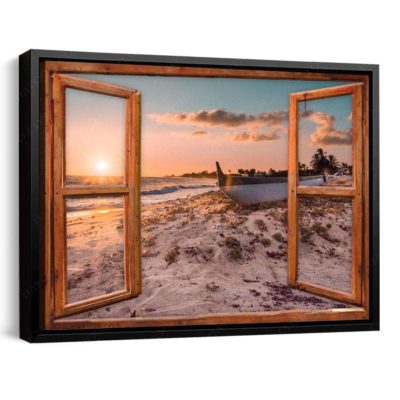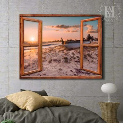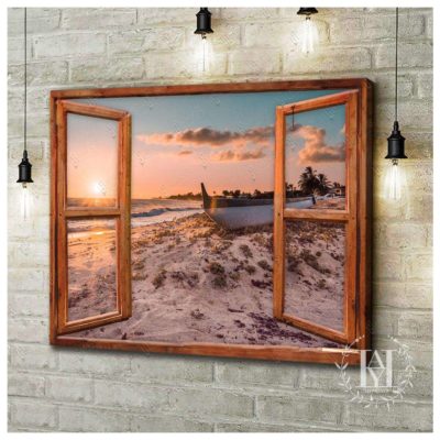 Hayooo Faux Window Canvas Beautiful Morning Seashore With Small Boat Wall Art For Home Decor